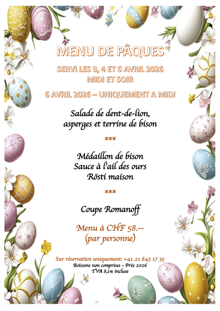 20 Mar 2026 Menu de Pâques ! par Secretariat | Classé dans : Actualités, Restaurant | 0 Un menu de Pâques tout spécialement concocté pour vous! Pensez à réserver au +41 21 843 17 35 Partager : Imprimer(ouvre dans une nouvelle fenêtre) Imprimer Envoyer un lien par e-mail à un ami(ouvre dans une nouvelle fenêtre) E-mail Partager sur WhatsApp(ouvre dans une nouvelle fenêtre) WhatsApp Partager sur Facebook(ouvre dans une nouvelle fenêtre) Facebook Partager sur X(ouvre dans une nouvelle fenêtre) X