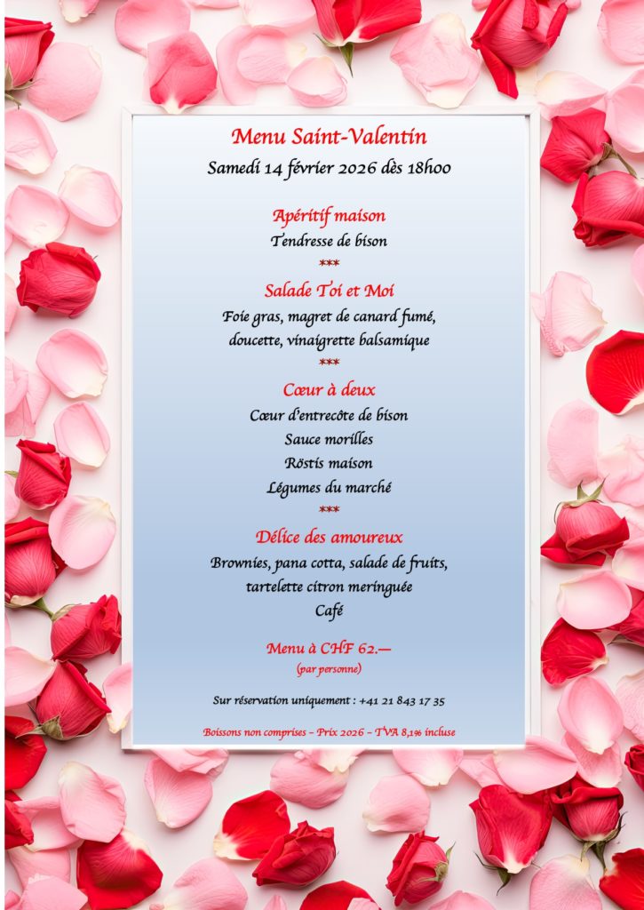 16 Jan 2026 Saint-Valentin par Annelize Périat | Classé dans : Actualités | 0 Venez déguster notre menu spécial St Valentin ! Pensez à réserver au 021 843 17 35 ! Partager : Cliquer pour imprimer(ouvre dans une nouvelle fenêtre) Imprimer Cliquer pour envoyer un lien par e-mail à un ami(ouvre dans une nouvelle fenêtre) E-mail Cliquez pour partager sur WhatsApp(ouvre dans une nouvelle fenêtre) WhatsApp Cliquez pour partager sur Facebook(ouvre dans une nouvelle fenêtre) Facebook Cliquer pour partager sur X(ouvre dans une nouvelle fenêtre) X